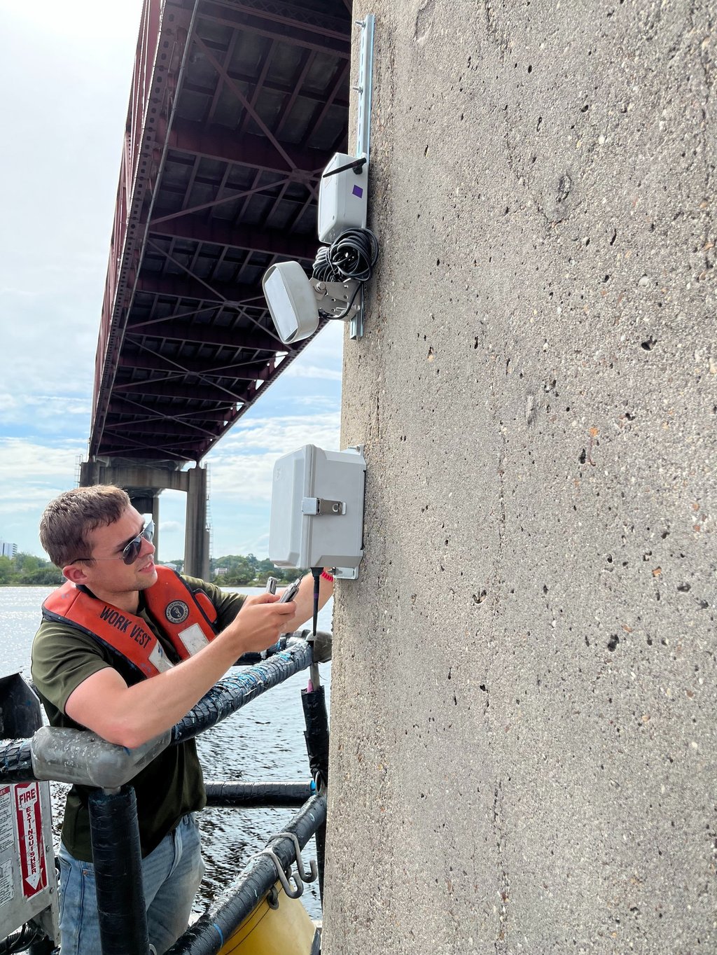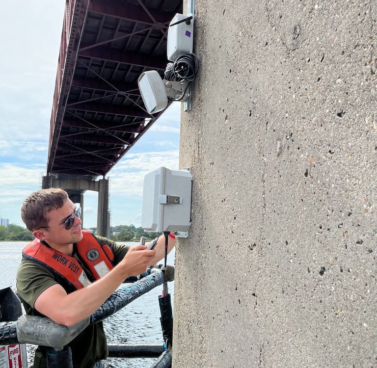 Here I am at a bridge in Florida installing an advanced structural health monitoring system for real-time data collection.